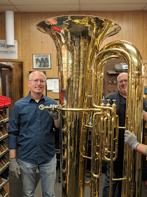 My son and I had the rare privilege of seeing - and playing - the Harvard tuba this morning out at Dillon Music. Matt Walters and his team did a fantastic job on this historic beast! Here are a few shots from our time, starting with a before and after comparison: