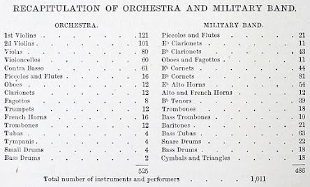 As you perhaps picked up from the title page, this musical event was "to commemorate the restoration of peace throughout the land," referring to the end of the Civil War four years earlier. But what was of greatest interest to me, for starters, was the magnitude of the musical forces Gilmore assembled.